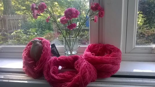 The yarn is hand dyed and rinsed in a variety of colours. Natural yarns are also available in white beige and brown.
